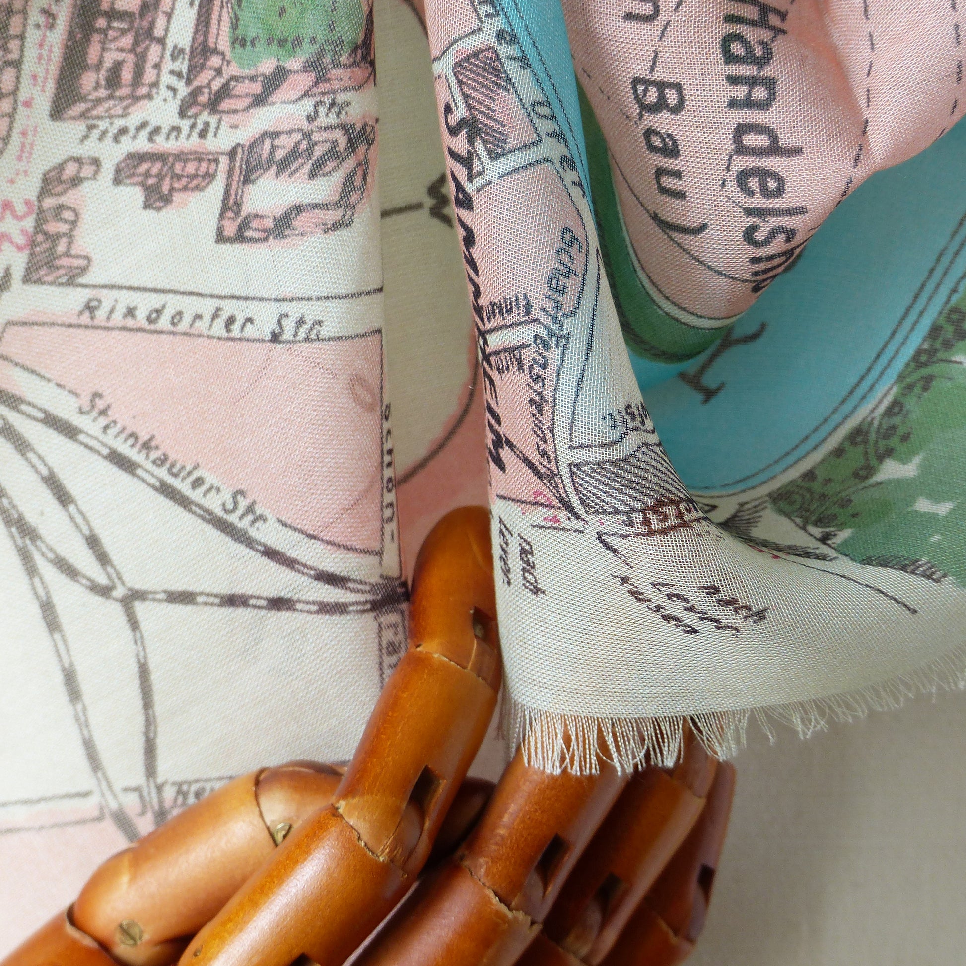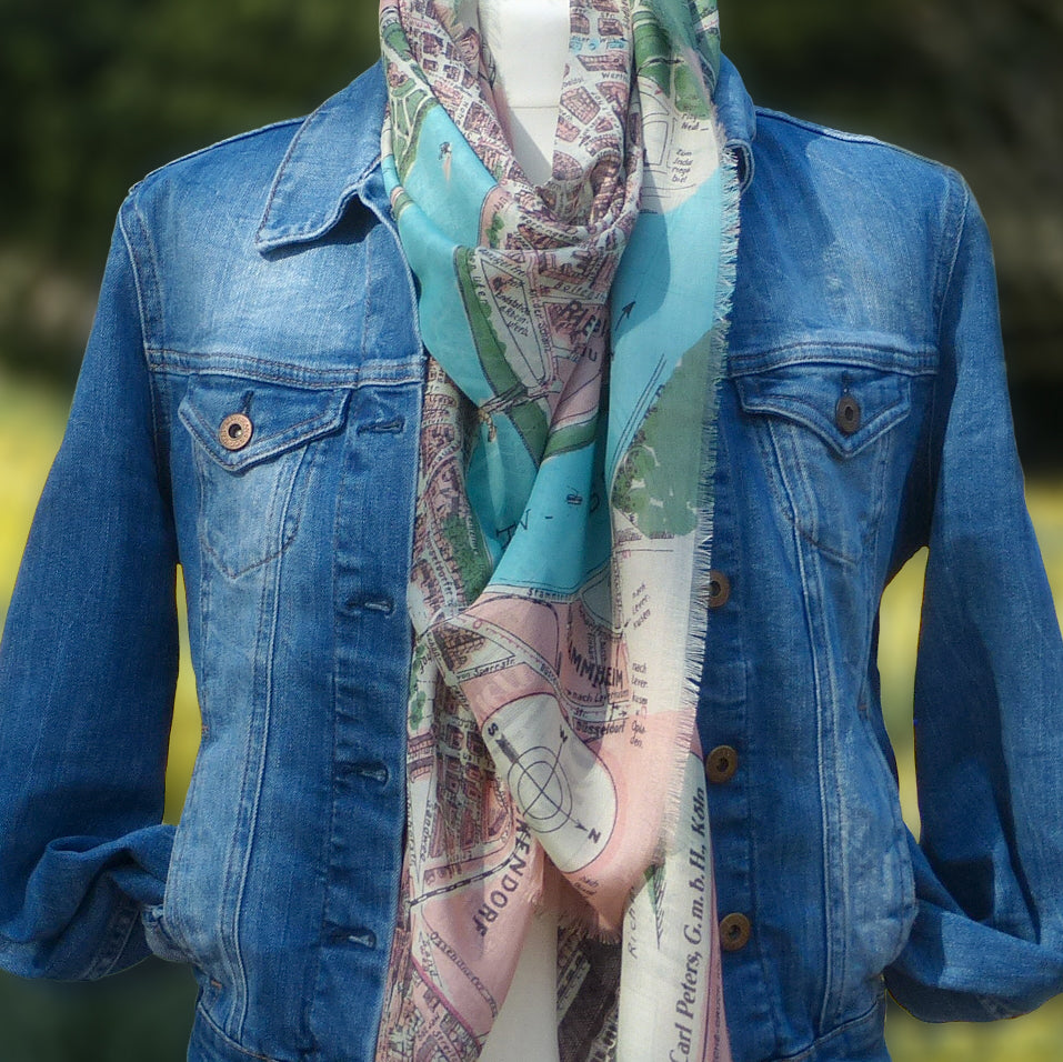 Dieses bildschöne Tuch ist das ideale Accessoire für alle, die außergewöhnliche Motive lieben! Es zeigt einen NEU umgesetzten wunderbar detaillierten historischen Plan der Stadt Köln aus dem Jahr 1936 in schmeichelnden Farben. Es ist großzügige 140 x 140 cm groß und hat rundum zarte Fransen. Dieser Kombi-Partner begleitet dich den ganzen Tag und das ganze Jahr. Es eignet sich in den Wintermonaten als zartes, wärmendes Accessoire oder als leichte Abdeckung während der heißen Jahreszeit, denn es ist aus Modal gefertigt, einem veredelten pflanzlichen Material mit vielseitigen Trageeigenschaften.